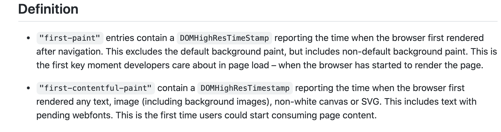 在 html 插件对生成的 script 标签做 defer 处理后,first-paint 可能就不在适合判断内容渲染,而 content-paint 对应的是文字,图片或者非空白 canvas 和 svg,很贴合 spa 的场景,在无 loading 的情况下就等于业务内容展示的时间。