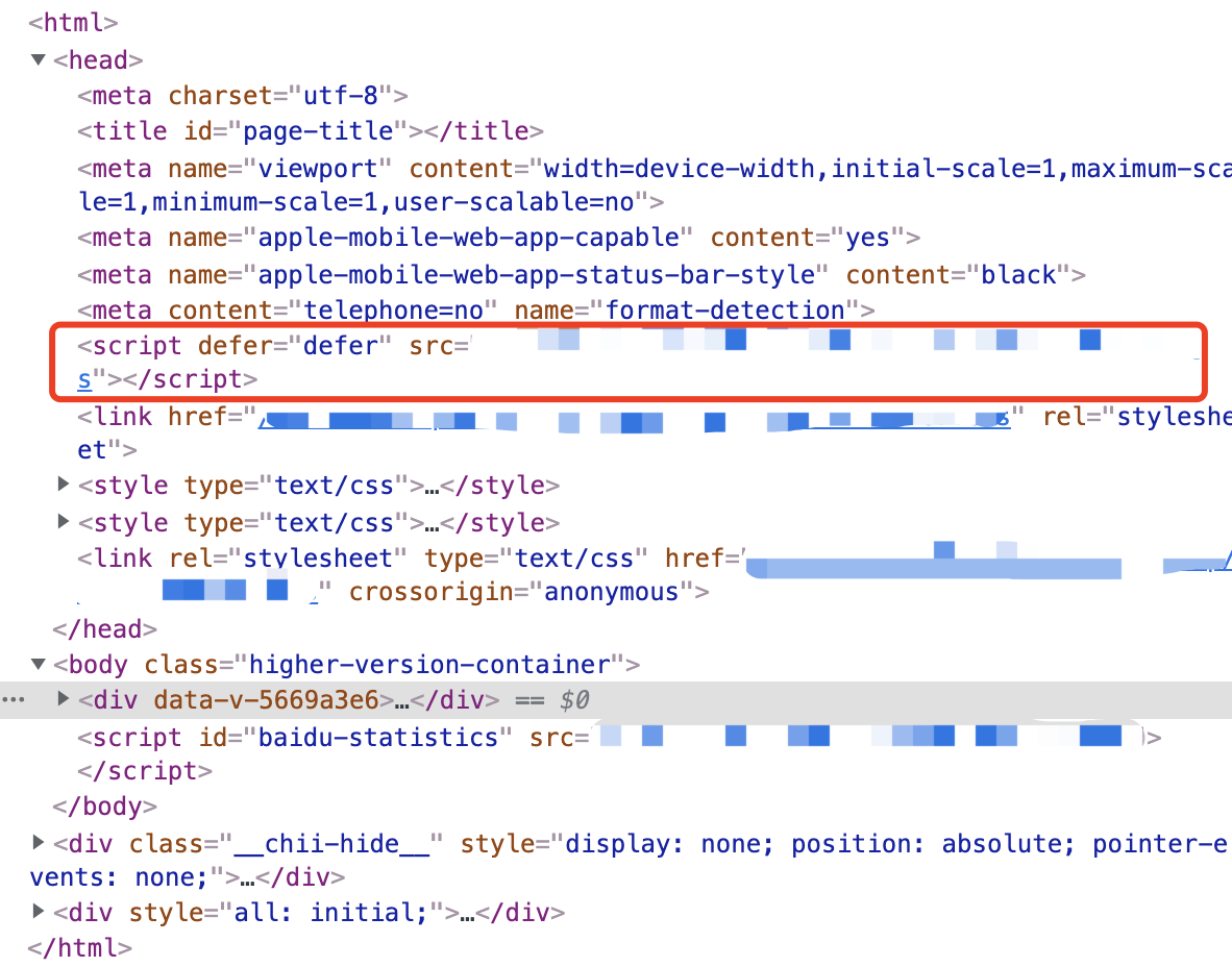 script 标签被挪到了 head 标签中,并添加了 defer 属性( 关于 defer 可参考 )