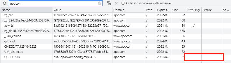 首先观察 qcc 的 sessionid 是如何存储在 cookie 中的: