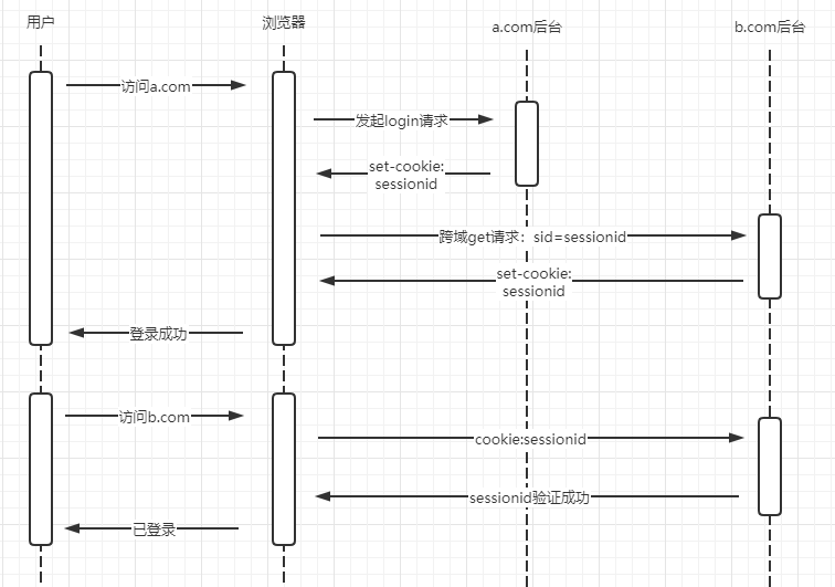 由于 a.com 和 b.com 使用的同一个 sessionid 标识用户状态,当用户在任意站点登出时,只需要在服务端将此 sessionid 失效即可同时让另一站点登录状态失效。