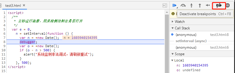 此时需要点一下那个蓝色的“Resume script execution”程序才会继续执行,这中间会有一定的时间差,通过判断这个时间差大于一定的值就认为是打开了开发者工具。这个方法并不会误伤,当没有打开开发者工具时遇到 debugger 标签不会暂停。