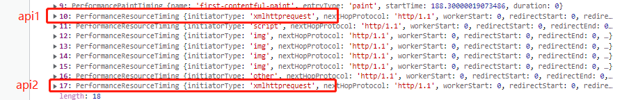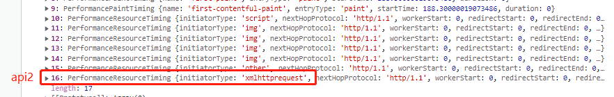 当我们在 api1 还未返回的时候调用 performance.getEntries,拿到的数据如下: