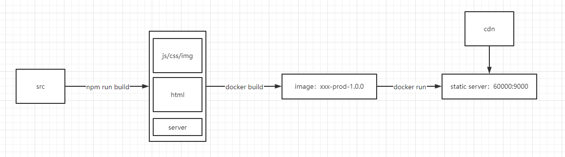 原本的纯前端项目是由 docker 进行部署的,每个项目中都需要一个小型的“静态资源服务器”实现输出静态资源。流程大概如下:
