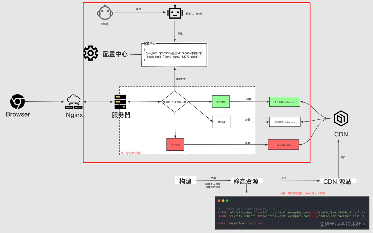 后端配置隔离相对比较好做,只要在服务启动时从配置中心拉取配置即可。而前端的配置如果需要在构建后获取的话,只能通过 BFF 修改 HTML 注入全局变量实现。
